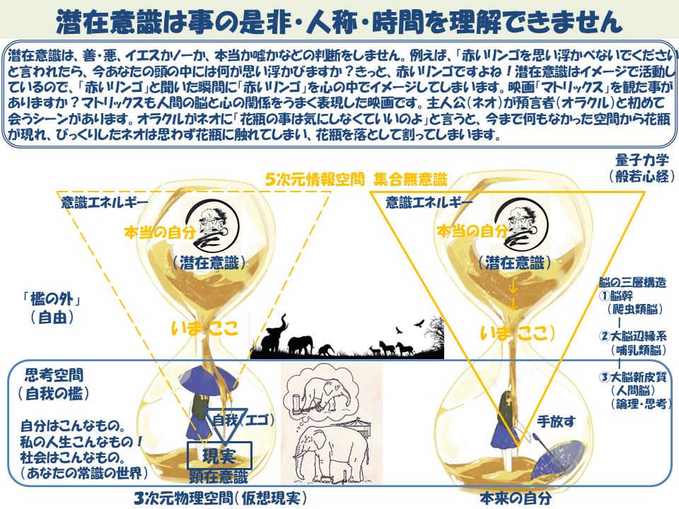 つまり潜在意識のアウトプット・投影が「現実化する」ということです。この事を図解で可視化して表現したものが「心の砂時計」図です。この原理とメカニズムが腑に落ちれば、あなたの現実は、「想いの万華鏡」です。「心の砂時計」(仕組み)を使わない手はありません。