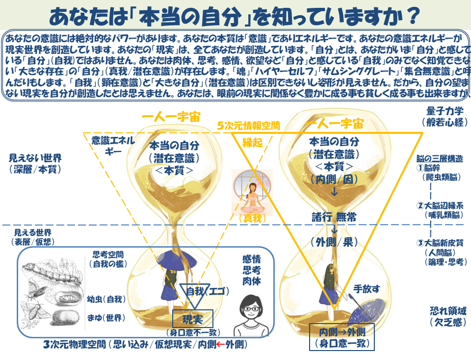 あなたの意識には絶対的なパワーがあります。あなたの本質は「意識」でありエネルギーです。あなたの意識エネルギーが現実世界を創造しています。あなたの「現実」は、全てあなたが創造しています。「自分」とは、あなたがいま「自分」と感じている「自分」(自我)ではありません。あなたは肉体、思考、感情、欲望など「自分」と感じている「自我」のみでなく知覚できない「大きな存在」の「自分」(真我/潜在意識)が存在します。「魂」「ハイヤーセルフ」「サムシンググレート」「集合無意識」と呼んだりもします。「自我」(顕在意識)と「大きな自分」(潜在意識)は区別できないし姿形が見えません。だから、自分の望まない現実を自分が創造したとは思えません。あなたは、眼前の現実に関係なく豊かに成る事が出来ます。貧しく成る事も出来ます。。