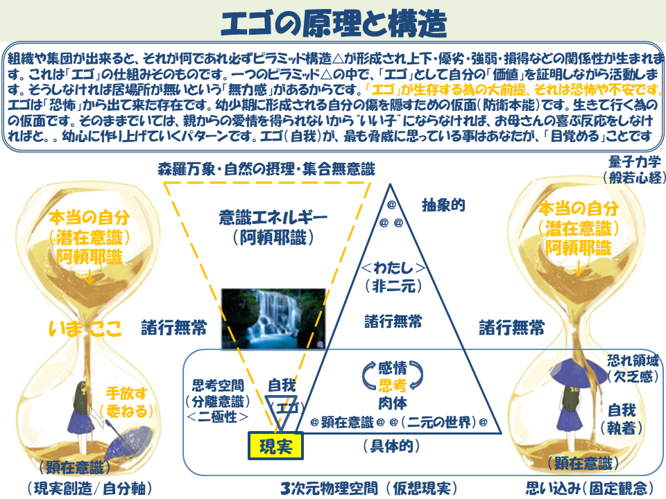 組織や集団が出来ると、それが何であれ、必ずピラミッド構造(△▽)が形成され上下・優劣・強弱・損得などの関係性が生まれます。そして、これは、「エゴ」の仕組みそのものです。組織や集団が出来ると、それが何であれ、必ずピラミッド構造(△▽)が形成され上下・優劣・強弱・損得などの関係性が生まれます。これは「エゴ」の仕組みそのものです。ひとつのピラミッド△の中で「エゴ」として自分の「価値」を証明しながら生きて行く事になります。そうしなければ「居場所」がないという無力感があるからです。
