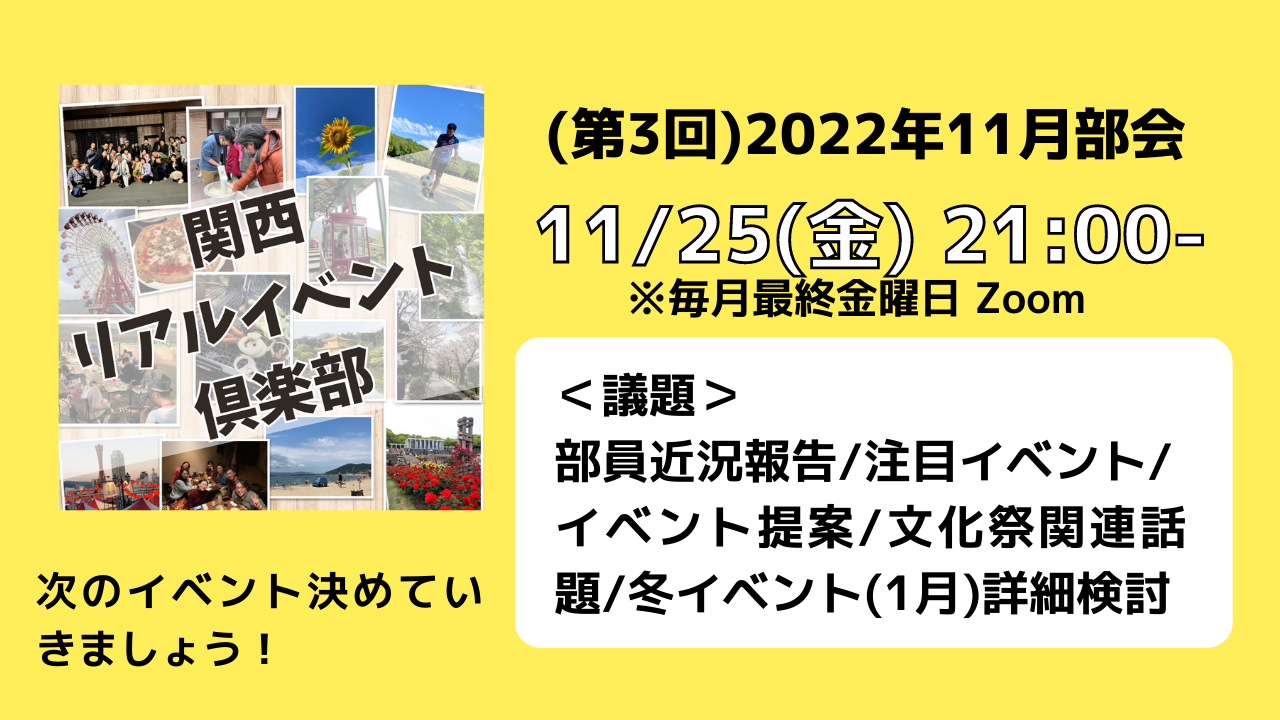 ちょうど年末あたりに、下山さんが企画するフットサルもあるので、その企画とコラボして私が関西リアルイベント倶楽部として忘年会を計画するのもありかもしれないですね。もちろん、そちらだけの参加と言うのもありなので。