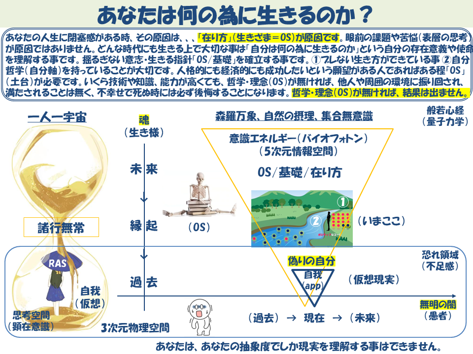 あなたの人生に閉塞感がある時、その原因は、、、「在り方」(生きざま=OS)が原因です。眼前の課題や苦悩(表層の思考)が原因ではありません。どんな時代にも生きる上で大切な事は「自分は何の為に生きるのか」という自分の存在意義や使命を理解する事です。揺るぎない意志・生きる指針「OS/基礎」を確立する事です。①ブレない生き方ができている事 ②自分哲学(自分軸)を持っていることが大切です。人格的にも経済的にも成功したいという願望がある人であればある程「OS」(土台)が必要です。いくら技術や知識、能力が高くても、哲学・理念(OS)が無ければ、他人や周囲の環境に振り回され、満たされることは無く、不幸せで死ぬ時には必ず後悔することになります。哲学・理念(OS)が無ければ、結果は出ません。そういった生きる哲学(OS)が不足し人格が未熟であれば、どこまで行っても心底から満たされる事は無く上辺の成功は出来ても、死ぬ時に「何のための人生だったか?」と必ず後悔します。目には見えない人間性の大きさ・深さ(OS)こそが、人生の豊かな実りをもたらします。「目に見える部分」が気になってつい他人と自分を比較して焦ります。そんな時「目には見えない部分」「OS」がブレない生き方を可能にします。いまこのコロナ共生時代を生き抜くには、「本当の自分」(真我)を目指すことが不可欠です。そして一番の近道です。自分哲学(生き様/在り方)こそが「本物の生き方」ができるかどうかの分かれ目です。(自戒をこめて)