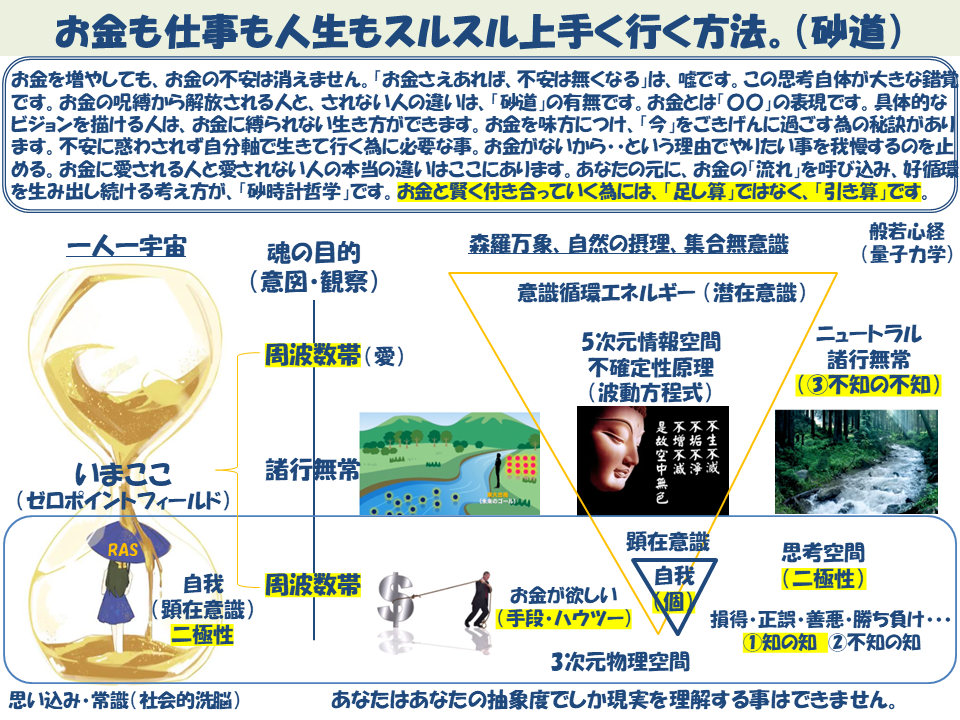 お金を増やしても、お金の不安は消えません。「お金さえあれば、不安は無くなる」は、嘘です。この思考自体が大きな錯覚です。お金の呪縛から解放される人と、されない人の違いは、「砂道」の有無です。お金とは「〇〇」の表現です。具体的なビジョンを描ける人は、お金に縛られない生き方ができます。お金を味方につけ、「今」をごきげんに過ごす為の秘訣があります。不安に惑わされず自分軸で生きて行く為に必要な事。お金がないから・・という理由でやりたい事を我慢するのを止める。お金に愛される人と愛されない人の本当の違いはここにあります。あなたの元に、お金の「流れ」を呼び込み、好循環を生み出し続ける考え方が、「砂時計哲学」です。お金と賢く付き合っていく為には、「足し算」ではなく、「引き算」です。