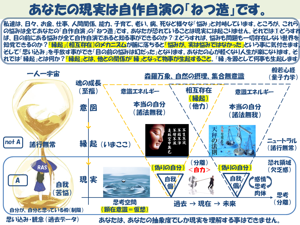 私達は、日々、お金、仕事、人間関係、能力、子育て、老い、病、死など様々な「悩み」と対峙しています。ところが、これらの悩みは全てあなたの「自作自演」の「ねつ造」です。あなたが恐れていることは現実には起こりません。それでは①どうすれば、目の前にある悩みが全て自作自演であると知る事ができるのか?②どうすれば、悩みも問題も一切存在しない世界を知覚できるのか?「縁起」(相互存在)のメカニズムが腑に落ちると「悩みが、実は悩みではなかった」という事に気付きます。そして「思い込み」を手放す事ができ「目の前の悩みは幻だった」となります。あなたの心が軽くなり人生が楽になります。それでは「縁起」とは何か?「縁起」とは、他との関係が「縁」となって物事が生起すること。「縁」を源として何事も生起します。言い方を変えると「自力で起こる物は何も無い」という事です。「縁起」という言葉は漢字2文字でシンプルです。が、極めて深い内容です。この宇宙の根本原理です。どれだけ腑に落ちているかが重要です。「縁起」が、腑に落ちていないと人生はどんどん苦しくなります。あなたの「現実」はあなたの「認識」(縁起)から始まります。現実世界で経験する事はあなたの「認識」(縁起)が先です。「認識」(縁起)→常識→習慣(行動)→「現実」の順で現実化が起こって来ます。お金も、仕事も、人間関係も、健康も、あなたが「いまここ」でどの様に「認識」しているか(思い込み・確信)で決まっています。「認識」→常識→習慣→「現実」です。
