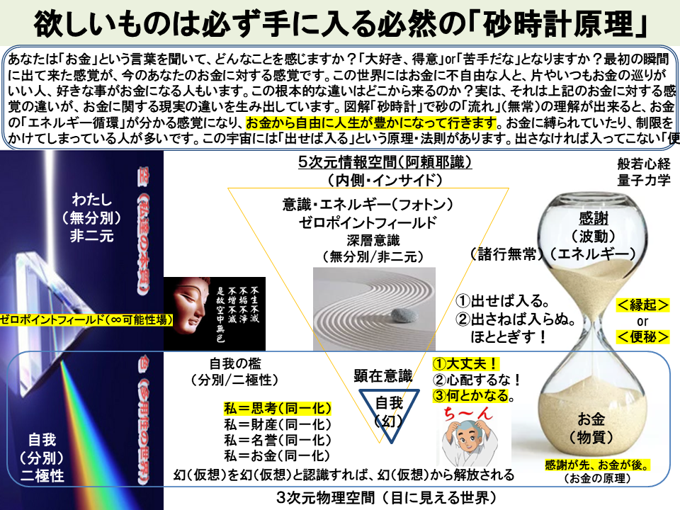 あなたは「お金」という言葉を聞いて、どんなことを感じますか?「大好き、得意」or「苦手だな」となりますか? 最初の瞬間に出て来た感覚が、今のあなたの「お金」に対する感覚です。この世界には、お金に不自由な人と、片や、いつもお金の巡りがいい人、好きな事がお金になる人もいます。この根本的な違いは、どこから来るのか? 実は、それは、上記のお金に対する感覚の違いが、お金に関する「現実」の違いを生み出しています。図解「こころの砂時計」で、砂の「流れ」=(諸行無常・縁起)の概念が出来ると、お金の「エネルギー循環」の概念が腑に落ちて、お金から自由になり、人生が豊かになって行きます。お金に縛られていたり、制限をかけてしまっている人は多いです(過去の私です)。この宇宙には、「出せば=入る」という原理原則(自然の摂理)があります。これは裏返してみれば「出さなければ入ってこない」(便秘の法則)でもあります。
