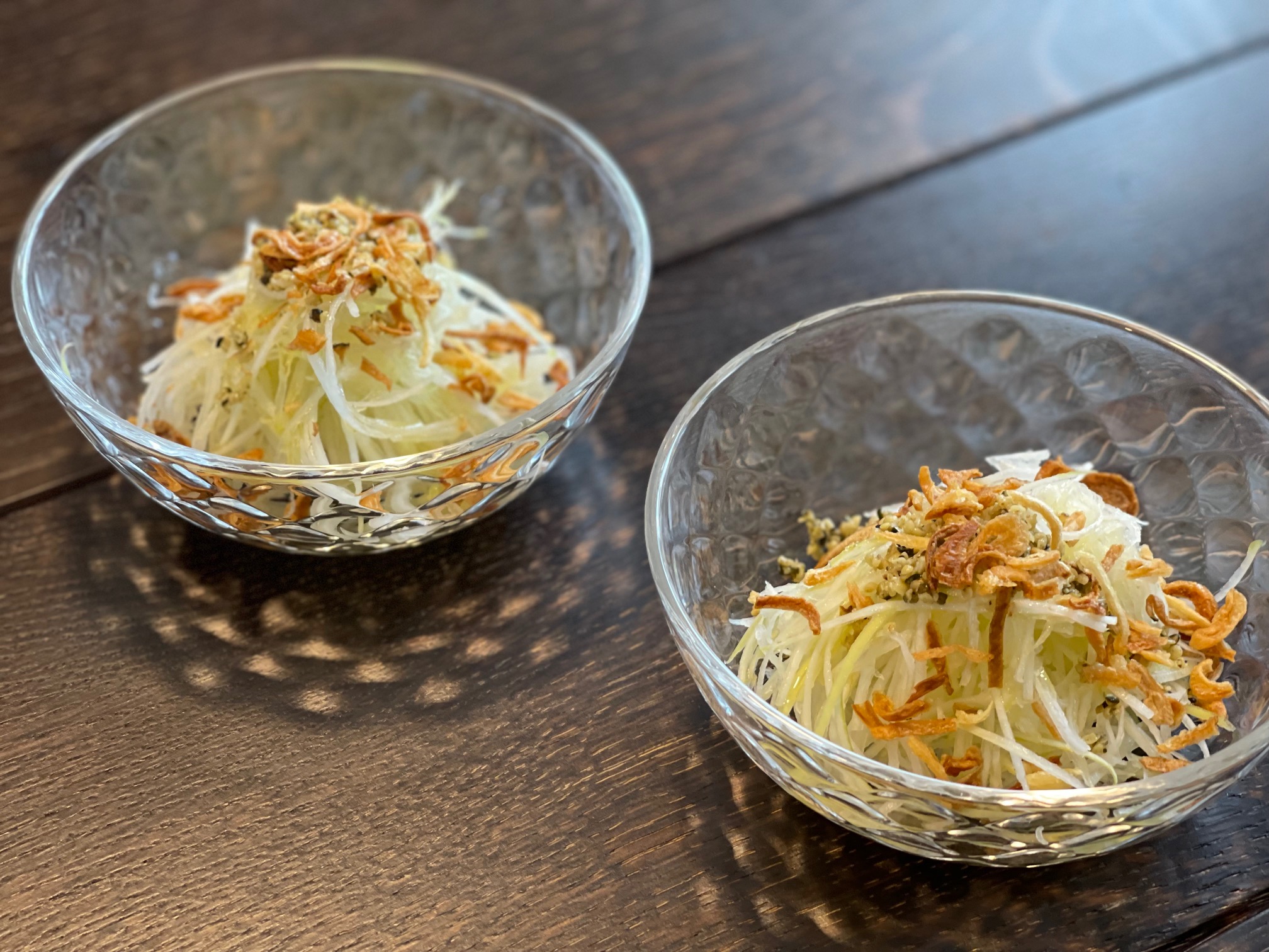 大根、セロリ(下の白い部分)、オリーブオイル、岩塩、フライドオニオン、ヘンプシード