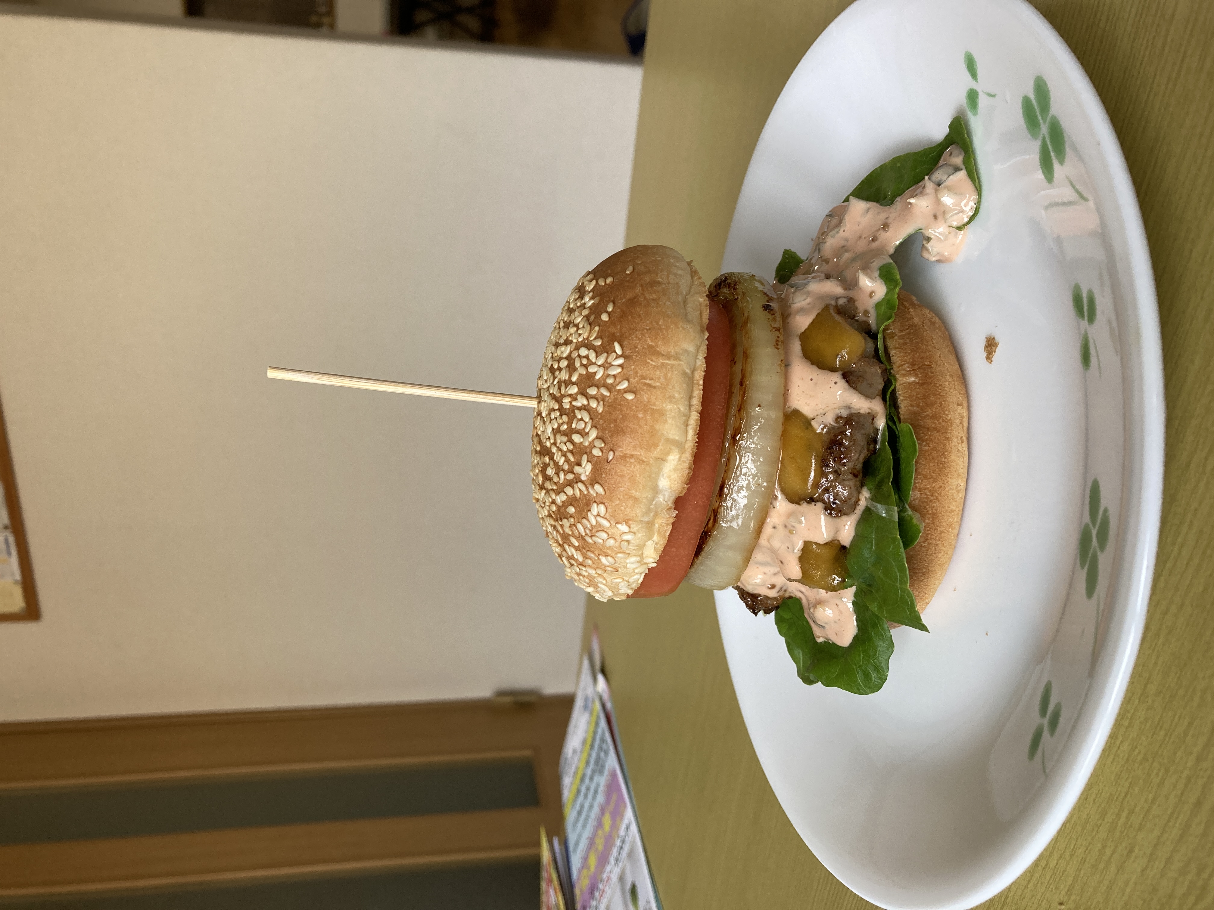 源吾牛の粗挽きミンチ、ハンバーガーにいたしました。