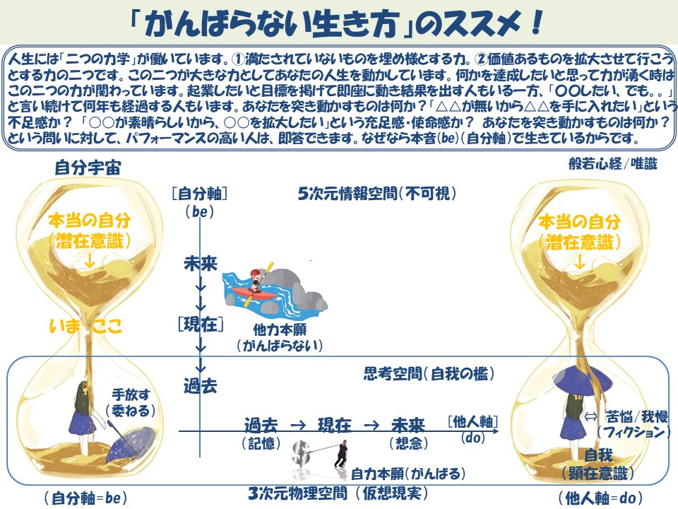 あなたの「本質=be」(生き様=時間軸)が変わり、習慣(潜在意識)が変わらなければ、いくらあなたが一所懸命に「頑張っても」あなたの「人生」(現実)は変わりません。たった一度の人生、前者(自分軸=be)(砂時計の上側)=<川下り>=「他力本願」(楽ちん)で生きなければ、死ぬ時にきっと後悔します。