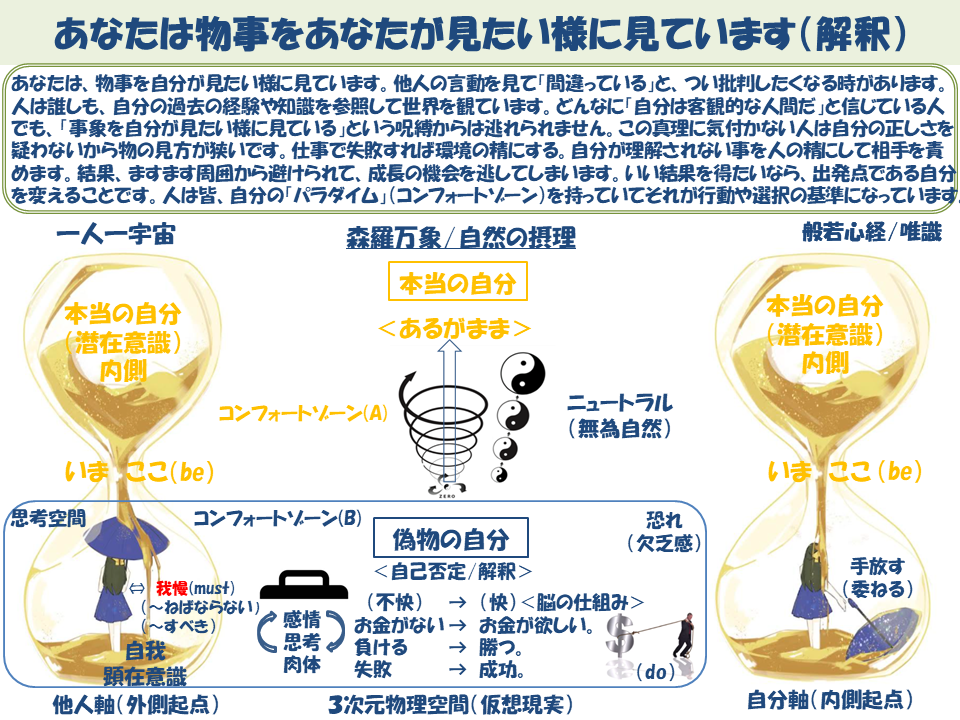 人は皆、自分の「パラダイム」(コンフォートゾーン)を持っていてそれが行動や選択の基準になっています。もし自分が思うような生活を送れていないなら、自分のパラダイムに問題があります。あなたが、「どうするか=do」は、あなたが、「どう在るか=be」から来ています。前者は、「無様・ぶざま/do」、後者は、「生き様」(be)です。