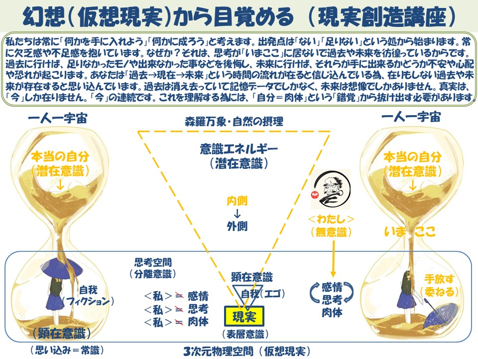 その為、自分はこの世界から制限を受けて常に何かに欠乏し、不足しているという「思考」が起こります。3次元世界や「自我」や「欠乏し不足している」という「思い込み」は、架空の「幻想」であるという事に「気付く」必要があります。