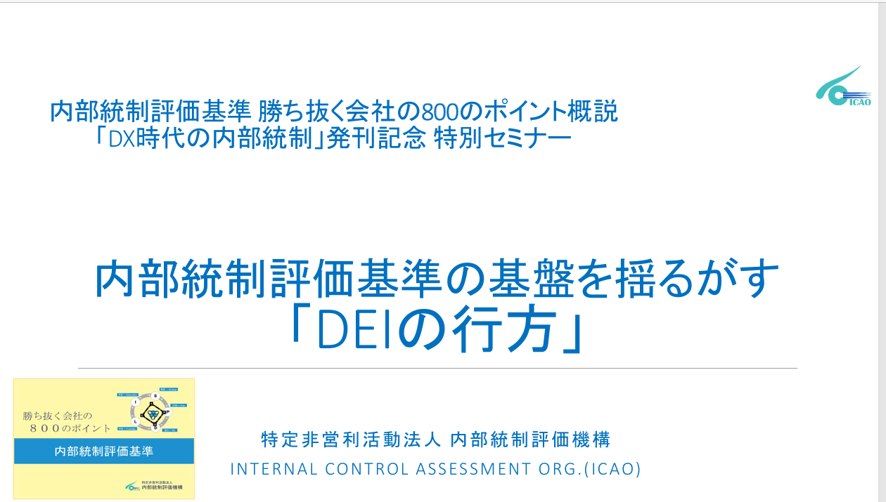 ICAOが共催している6月のDX事業革新研究会では、電子書籍「DX時代の内部統制」発信記念・特別講義として、「DEIの行方」と題して、トランプ大統領の大統領令発令で話題、DEI(多様性、公平性、包括性)について話をしました。