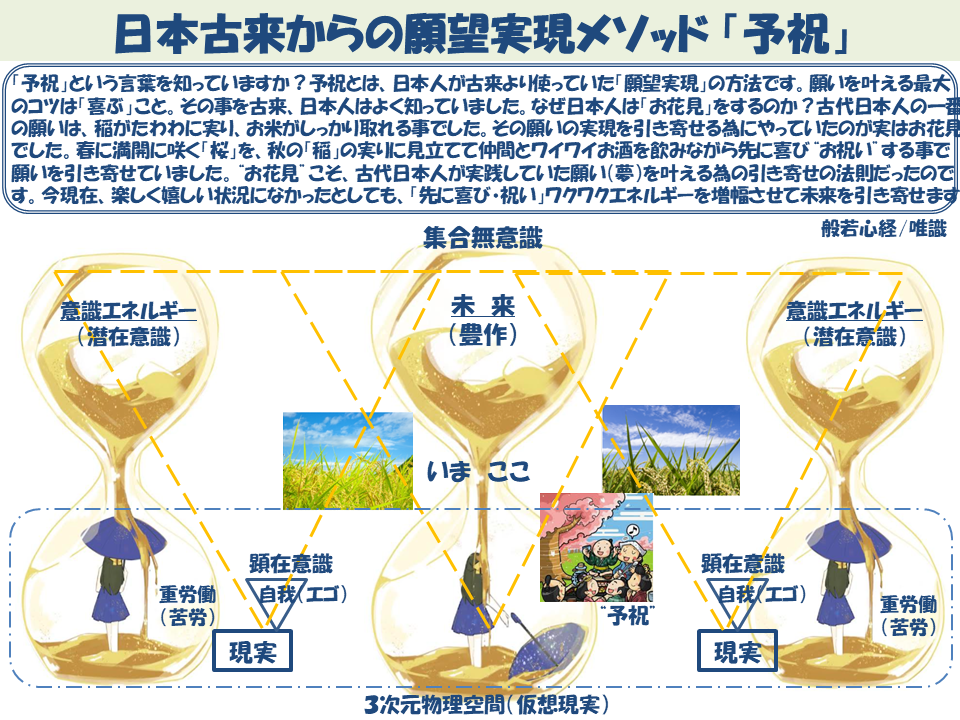 「予祝」という言葉を知っていますか?予祝とは、日本人が古来より使っていた「願望実現」の方法です。願いを叶える最大のコツは「喜ぶ」こと。その事を古来、日本人はよく知っていました。なぜ日本人は「お花見」をするのか?古代日本人の一番の願いは、稲がたわわに実り、お米がしっかり取れる事でした。その願いの実現を引き寄せる為にやっていたのが実はお花見でした。春に満開に咲く「桜」を、秋の「稲」の実りに見立てて仲間とワイワイお酒を飲みながら先に喜び“お祝い”する事で願いを引き寄せていました。“お花見”こそ、古代日本人が実践していた願い(夢)を叶える為の引き寄せの法則だったのです。今現在、楽しく嬉しい状況になかったとしても、「先に喜び・祝い」ワクワクエネルギーを増幅させて未来を引き寄せます。