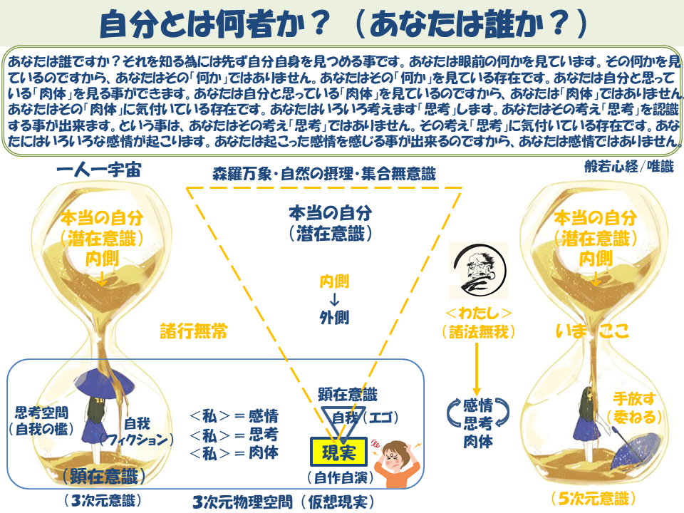 あなたは誰ですか?それを知る為には先ず自分自身を見つめる事です。あなたは眼前の何かを見ています。その何かを見ているのですから、あなたはその「何か」ではありません。あなたはその「何か」を見ている存在です。あなたは自分と思っている「肉体」を見る事ができます。あなたは自分と思っている「肉体」を見ているのですから、あなたは「肉体」ではありません。あなたはその「肉体」に気付いている存在です。