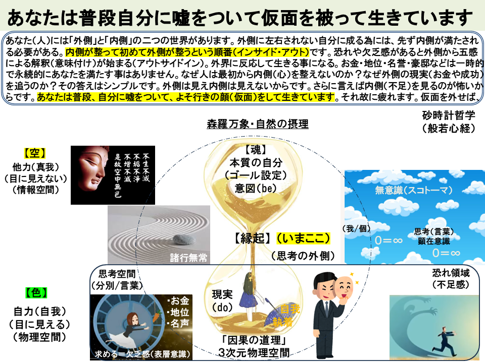 あなた(人)には「外側」と「内側」の二つの世界があります。外側に左右されない自分に成る為には、先ず内側が満たされる必要がある。内側が整って初めて外側が整うという順番(インサイド・アウト)です。恐れや欠乏感があると外側から五感による解釈(意味付け)が始まる(アウトサイドイン)。外界に反応して生きる事になる。お金・地位・名誉・豪邸などは一時的で永続的にあなたを満たす事はありません。なぜ人は最初から内側(心)を整えないのか?なぜ外側の現実(お金や成功)を追うのか?その答えはシンプルです。外側は見え内側は見えないからです。さらに言えば内側(不足)を見るのが怖いからです。あなたは普段、自分に嘘をついて、よそ行きの顔(仮面)をして生きています。それ故に疲れます。仮面を外せばいいだけです。仮面を外せば心が軽くなります。そのヒントが「心の砂時計」です。