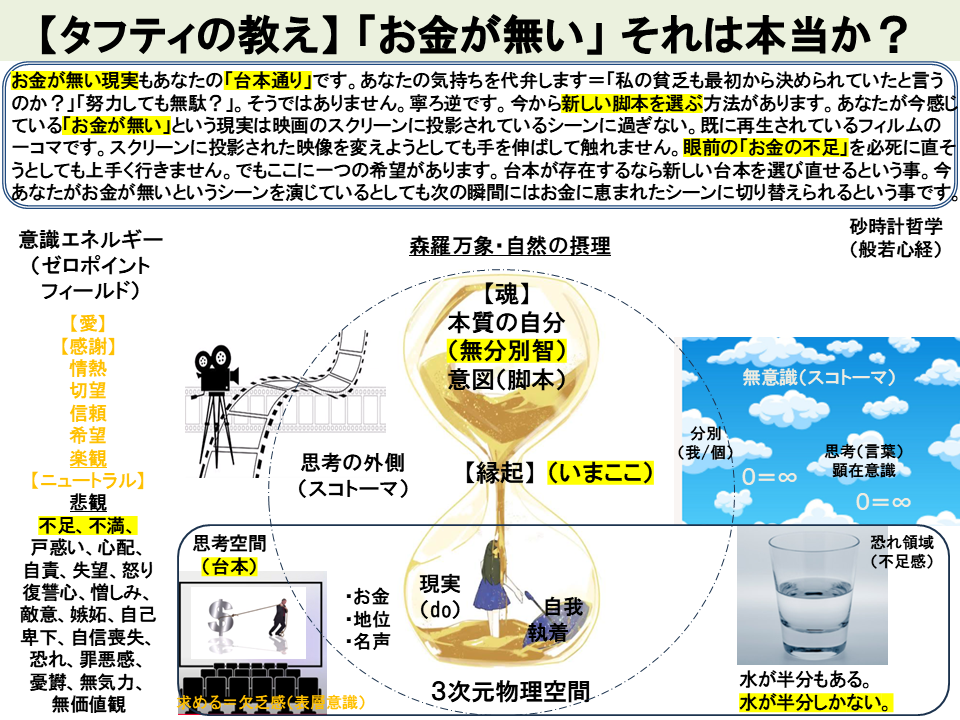 「お金が無い」現実も、あなたの「台本通り」です。ここであなたの気持ちを代弁します。=「私の貧乏も最初から決められていたと言うのか?」「努力しても無駄という事か?」。そうではありません。寧ろ逆です。今から新しい「脚本」を選ぶ方法があります。あなたが今感じている「お金が無い」という現実は、映画のスクリーンに投影されている一つの「シーン」に過ぎないのです。既に再生されているフィルムの「一コマ」です。スクリーンに投影された映像を変えようとしても、手を伸ばして触れません。眼前の「お金の不足」を必死に直そうとしても上手く行きません。でも、ここに一つの希望があります。「台本」が存在するなら、新しい台本を「選び直せる」ということです。今あなたが「お金が無い」というシーンを演じているとしても、次の瞬間には、お金に恵まれたシーンに切り替えられるという事です。その「仕組み」を教えているのが、「タフティの教え」です。そして、それは砂時計哲学の根本原理「諸行無常」です。