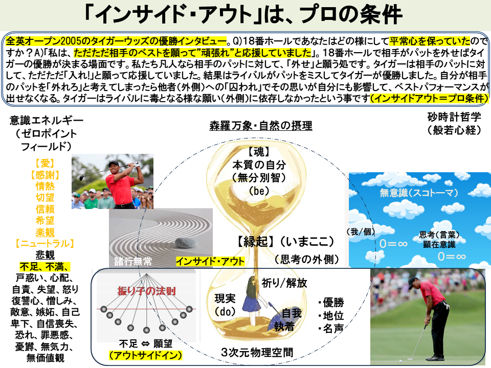 全英オープン2005のタイガーウッズの優勝インタビューでの一コマです。Q)18番ホールであなたはどの様にして平常心を保っていたのですか? A)「私は、ただただ相手のベストを願って”頑張れ”と応援していました」。18番ホールで相手がパットを外せば、タイガーの優勝が決まる場面です。私たち凡人なら、相手のパットに対して「外せ」と願う処です。タイガーは、相手のパットに対して、ただただ「入れ!」と願って応援していました。結果は、ライバルがパットをミスしてタイガーが優勝しました。自分が相手のパットを「外れろ」と考えてしまったら、他者(外側)への「囚われ」で、その思いが自分にも影響して、ベストパフォーマンスが出せなくなる(アウトサイド・イン)。タイガーは、ライバルに毒となる様な願い(外側)に依存しなかったという事です。「インサイド・アウト」は=プロの必須要件(宇宙の法則)です。