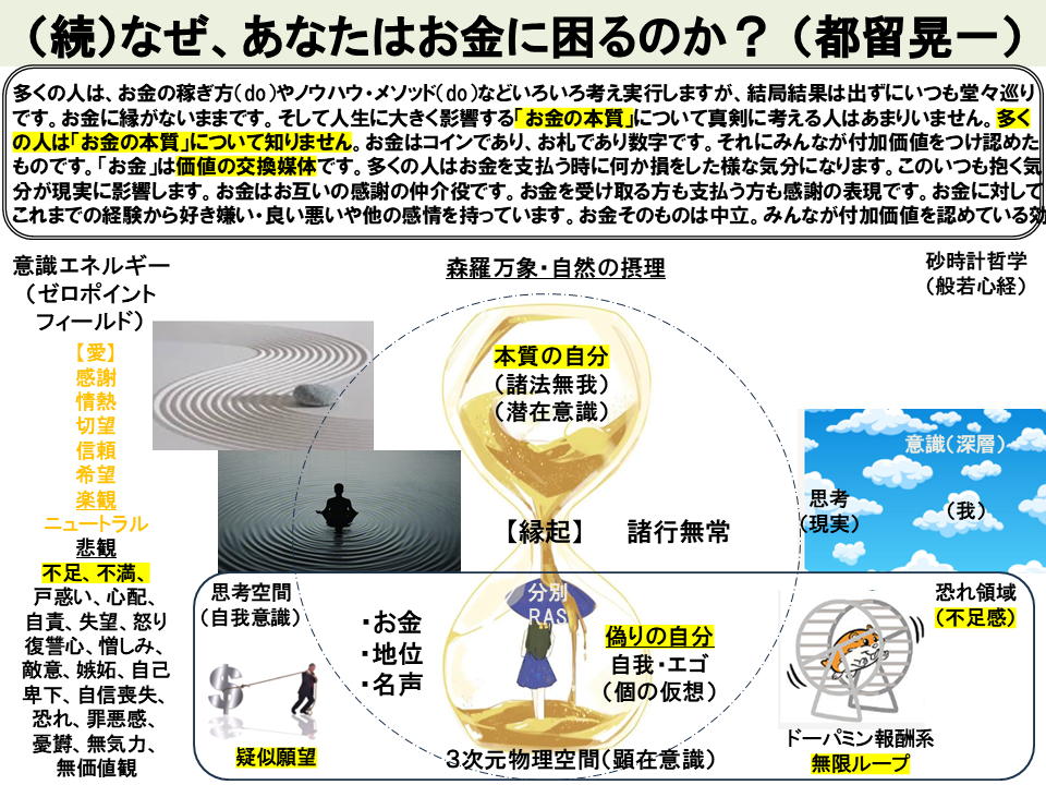 多くの人は、お金の稼ぎ方(do)やノウハウ・メソッド(do)などいろいろ考え実行しますが、結局結果は出ずにいつも堂々巡りです。お金に縁がないままです。そして、「お金の本質」について真剣に考える人はあまりいません。多くの人は「お金の本質」について知りません。お金はコインであり、お札であり数字です。それにみんなが付加価値をつけ認めたものです。「お金」は、相互の価値の交換媒体です。多くの人は、お金を支払う時に何か損をした様な気分になります。このいつも抱く気分が現実に影響します。お金はお互いの感謝の仲介役です。お金を受け取る方も支払う方も感謝の表現です。お金に対してこれまでの経験から好き嫌い・善悪・他の感情を持っています。お金そのものは、ニュートラルです。それにみんなが付加価値を認めている効力を発揮します。お金は、付加価値を持ったエネルギーです。お金は、感謝のエネルギーを持っています。エネルギーは、エネルギーの法則によって動きます。同じようなエネルギーは、同じ様な処に集まります。エネルギーを止めるとエネルギーは滞り、エネルギーを流せばエネルギーは流れ続けます。思考もエネルギーです。いくら頑張って働いても、あなたの思考(お金の閾値)がそのままあなたの経済状態になって現れます。お金に恵まれる様になるには、何かを頑張って動きまわる前に、あなたのお金に対する「考え方・思い込み」=「在り方」(be)を変える必要があります。