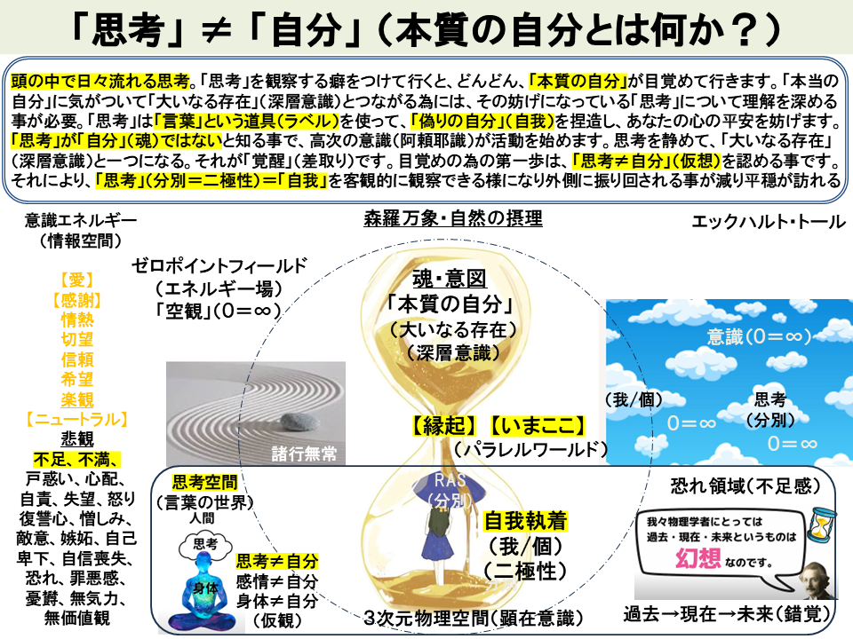 頭の中で日々流れる「思考」。「思考」を観察する癖をつけて行くと、どんどん、「本質の自分」が「目覚め」て行きます。「本当の自分」に気がついて、「大いなる存在」(深層意識)とつながる為には、その妨げになっている「思考」について理解を深める事が必要です。「思考」は、「言葉」という道具(ラベル)を使って、「偽りの自分」(自我)を捏造し、あなたの心の平安を妨げます。「思考」が「自分」(魂)ではないと知る事で、高次の意識(阿頼耶識)が活動を始めます。「思考」を静めて、「大いなる存在」(深層意識)と一つになる。それが「覚醒」(差取り)です。「目覚め」のための第一歩は、「思考≠自分」(仮想=アバター)を認める事です。それにより、「思考」(分別=二極性)=「自我」を客観的に観察できる様になり、外側に振り回される事が減り、平穏が訪れます。