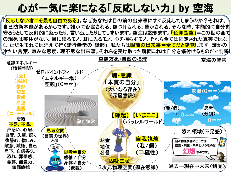 「反応しない者こそ最も自由である」。なぜあなたは目の前の出来事にすぐ反応してしまうのか?それは、自己防衛本能があるからです。誰かに否定される、傷つけられる、脅かされる、そんな時、本能的に自分を守ろうとして反射的に怒ったり、言い返したりしてしまいます。空海は説きます。「色即是空」=この世の全ての現象は実体がない。目に映るモノ、耳に入るモノ、心を揺らすモノ、それら全ては固定された真実ではなく、ただ生まれては消えて行く諸行無常の「縁起」。私たちは眼前の出来事=全てだと錯覚します。誰かの冷たい言葉、嫌みな態度、理不尽な出来事。それらを受け取った瞬間これは自分を傷付けるものだと判断し反応してしまいます。真実は、出来事そのものには「良い・悪い」も意味はありません。ニュートラルです。意味を与えているのは、他ならぬ自分自身の心です。眼前の事象にいちいち心をかき乱される必要はありません。「色即是空」=いま目に映るモノに振り回されるな。真実は「空」なのだから。あなたの心が意味を与えているだけです。それはただのラベル(仮想)です。