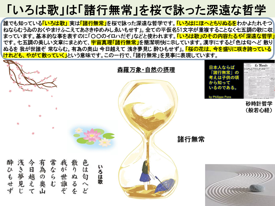誰でも知っている「いろは歌」 実は「諸行無常」を桜で詠った深遠な哲学です。「いろはにほへとちりぬるをわかよたれそつねならむうゐのおくやまけふこえてあさきゆめみしゑいもせす」。全ての平仮名51文字が重複することなく七五調の歌に収まっています。基本的な事を表すのに「〇〇のイロハだぞ」などと使われます。「いろは歌」のその内容たるや「深遠な哲学」です。七五調の美しい文章にまとめて、宇宙真理「諸行無常」を簡潔明快に示しています。漢字にすると「色は匂へど 散りぬるを 我が世誰ぞ 常ならむ。有為の奥山 今日越えて 浅き夢見じ 酔ひもせず」。「桜の花は、今を盛りに咲き誇っているけれども、やがて散っていく」という意味です。この一行で、「諸行無常」を見事に表現しています。「諸行無常」の「諸行」とは、全てのもの、 「無常」とは、「常が無い」という事です。この世の一切のものは変化する。続かない、移ろい変わって行くという仏法の説く、この世の「真理」を「色は匂へど 散りぬるを」と、桜に託して詠っています。この世の一切に「永遠」はありません。あなたの身も心も苦悩も常ならぬ。。と。。。