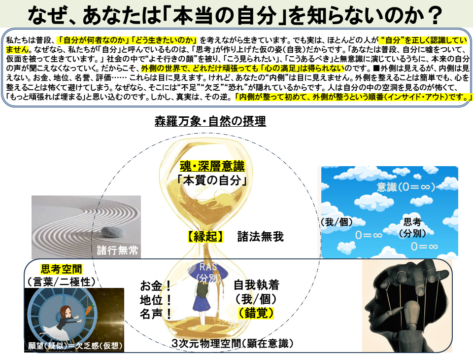 私たちは普段、「自分が何者なのか」、「どう生きたいのか」 を考えながら生きています。でも実は、ほとんどの人が “自分”を正しく認識していません。なぜなら、私たちが「自分」と呼んでいるものは、「思考」が作り上げた仮の姿(自我)だからです。「あなたは普段、自分に嘘をついて、仮面を被って生きています。」 社会の中で“よそ行きの顔”を被り、「こう見られたい」、「こうあるべき」と無意識に演じているうちに、本来の自分の声が聞こえなくなっていく。だからこそ、外側の世界で、どれだけ頑張っても 「心の満足」は得られないのです。■外側は見えるが、内側は見えない。お金、地位、名誉、評価…… これらは目に見えます。けれど、あなたの“内側”は目に見えません。外側を整えることは簡単でも、心を整えることは怖くて避けてしまう。なぜなら、そこには“不足”“欠乏”“恐れ”が隠れているからです。人は自分の中の空洞を見るのが怖くて、「もっと頑張れば埋まる」と思い込むのです。しかし、真実は、その逆。 「内側が整って初めて、外側が整うという順番(インサイド・アウト)です。」