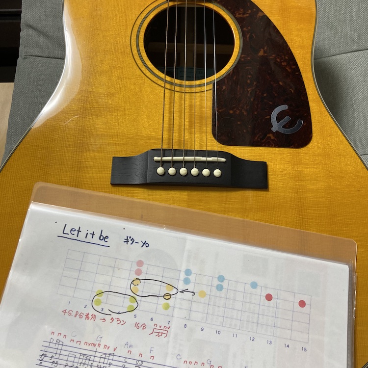 お手製のLet It Beのギターソロパートのタブ譜も印刷してもらって、スライドやチョーキング等、初めての技も挑戦しました😊面白かったです。
