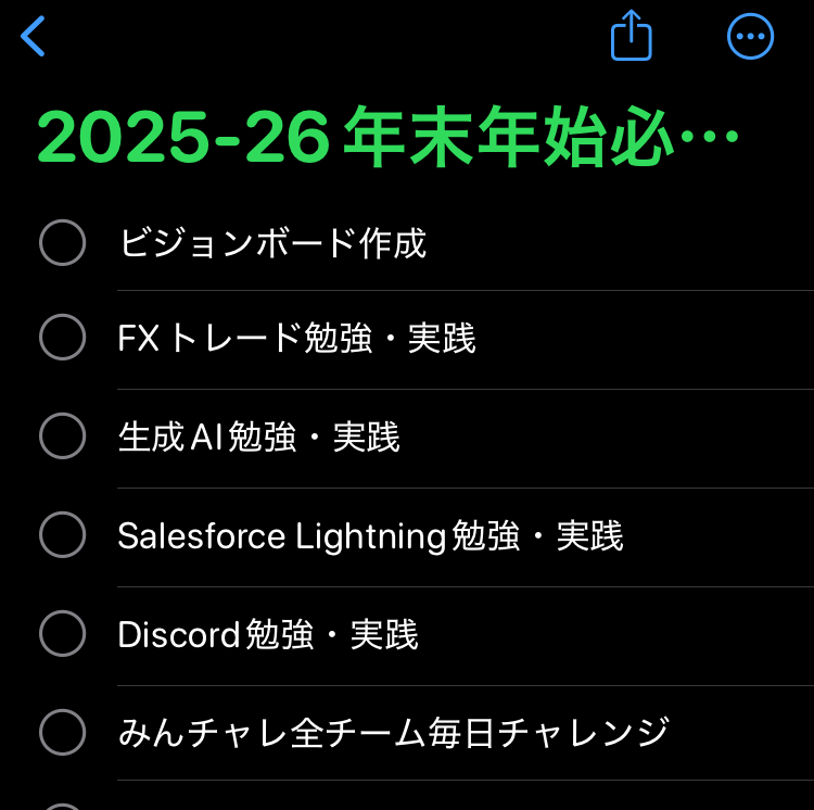 が、ゆっくりしているとあっという間に過ぎてしまうし、今回は特に期間中に学びたいこと、試したいことがたくさんあるので、必達目標をiPhoneのリマインダーにまとめました。全て達成できるように計画します👍