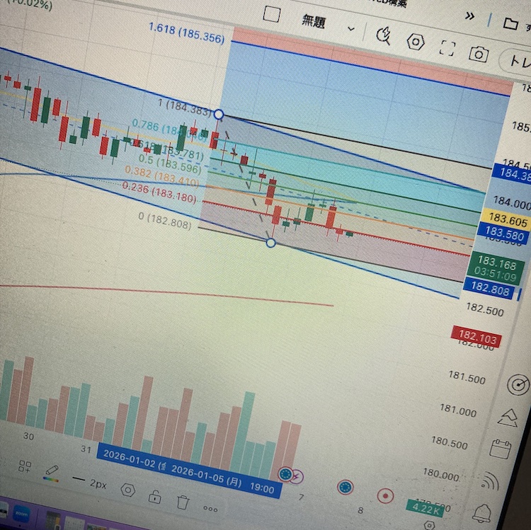 今日も為替トレードのオンライン勉強会で、大勢の前で画面共有しながらテクニカル分析することになり、フィボナッチというインジケーターを使ってシナリオを読む実践をしました😅
