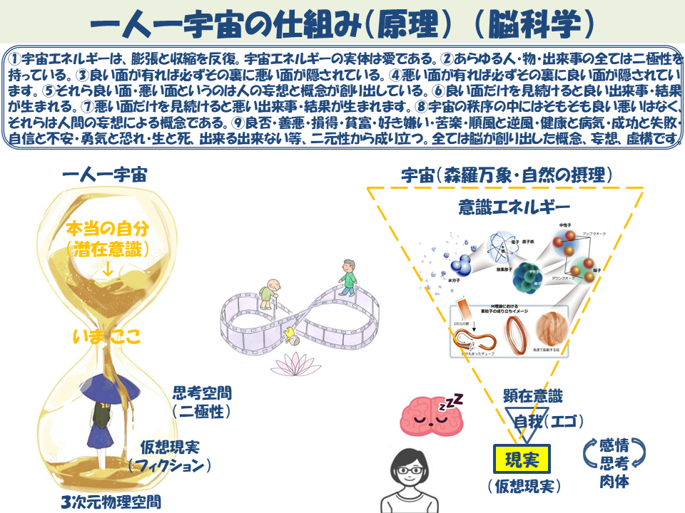 ①宇宙エネルギーは、膨張と収縮を反復。宇宙エネルギーの実体は愛である。②あらゆる人・物・出来事の全ては二極性を持っている。③良い面が有れば必ずその裏に悪い面が隠されている。④悪い面が有れば必ずその裏に良い面が隠されています。⑤それら良い面・悪い面というのは人の妄想と概念が創り出している。⑥良い面だけを見続けると良い出来事・結果が生まれる。⑦悪い面だけを見続けると悪い出来事・結果が生まれます。⑧宇宙の秩序の中にはそもそも良い悪いはなく、それらは人間の妄想による概念である。⑨良否・善悪・損得・貧富・好き嫌い・苦楽・順風と逆風・健康と病気・成功と失敗・自信と不安・勇気と恐れ・生と死、出来る出来ない等、二元性から成り立つ。全ては脳が創り出した概念、妄想、虚構です。