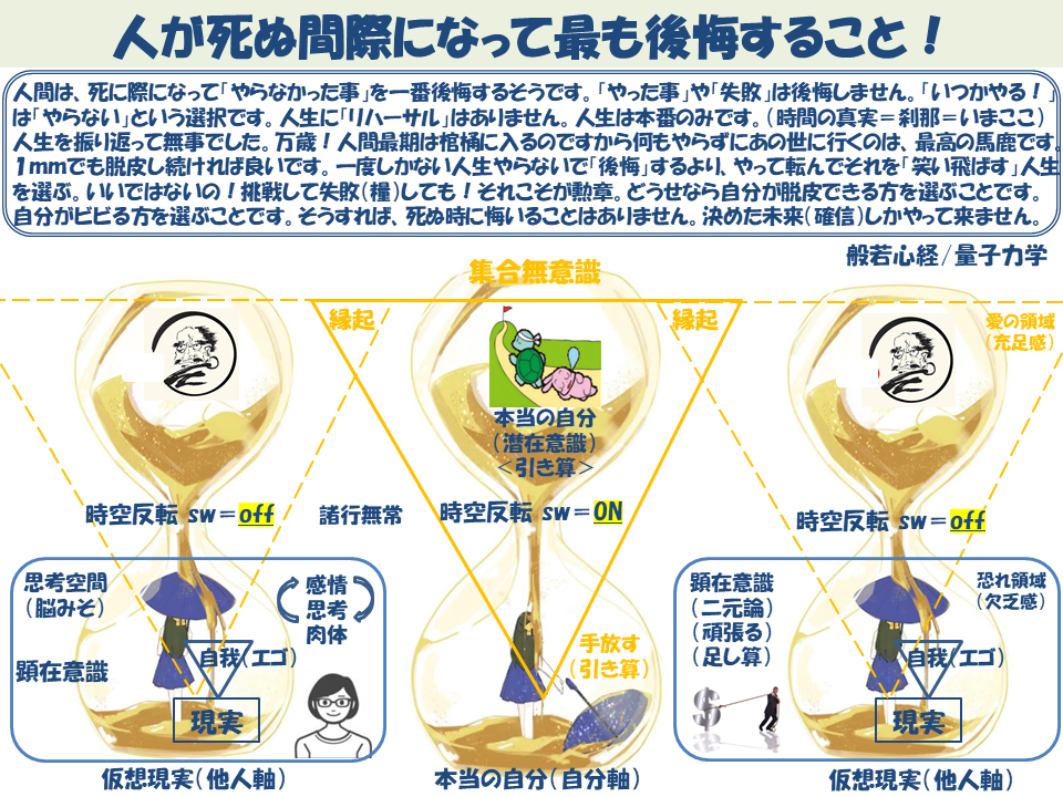 人間は、死に際になって「やらなかった事」を一番後悔するそうです。「やった事」や「失敗」は後悔しません。「いつかやる!」は「やらない」という選択です。人生に「リハーサル」はありません。人生は本番のみです。(時間の真実=刹那=いまここ)人生を振り返って無難で無事でした。万歳!人間最期は棺桶に入るのですから何もやらずにあの世に行くのは、最高の馬鹿です。1mmでも脱皮し続ければ良いです。一度しかない人生やらないで「後悔」するより、やって転んでそれを「笑い飛ばす」人生を選ぶ。いいではないの!挑戦して失敗(糧)しても!それこそが勲章。どうせなら自分が脱皮できる方を選ぶことです。自分がビビる方を選ぶことです。そうすれば、死ぬ時に悔いることはありません。決めた未来(確信)しかやって来ません。決めた未来(確信)しかやって来ません。決めない未来(ゴール)は未来永劫にやって来ません。「いつか」と「いい女」は向こうからはやって来ません。あなたの「不安の正体」は自分自身が、「ゴール」を決め切れていないだけです。将来に対する不安は「ゴール」を決めるだけで解決します。何であれ「ゴール」(自分軸)が決まれば、「いまここ」=出発点(原点)が定まります。「出発点」(原点)が定まり、挑戦し続ける事ができれば、あなたが諦めない限り、「成功するしかありません」。「常識」=「他人の人生」を生きて幸せに成れるはずがありません。「非常識」=(他力本願=縁起)に生きることが最も「後悔しない」生き方です。