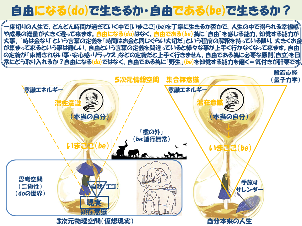 一度切りの人生で、どんどん時間が過ぎていく中で[いまここ](be)を丁寧に生きるか否かで、人生の中で得られる幸福感や成果の総量が大きく違って来ます。自由になる(do)はなく、自由である(be)為に“自由”を感じる能力、知覚する能力が大事。“時は金なり”という言葉の定義を『時間はお金と同じぐらい大切だ』という程度の解釈を持っている限り、大きくお金が集まって来るという事は難しい。自由という言葉の定義を間違っていると様々な事が上手く行かなくなって来ます。自由の定義が『束縛されない事・安心感・リラックス』などの定義だと上手く行きません。自由である為に必要な原則(自立)を日常にどう取り入れるか?自由になる(do)ではなく、自由である為に「野生」(be)を知覚する能力を磨く=気付きが肝要です。