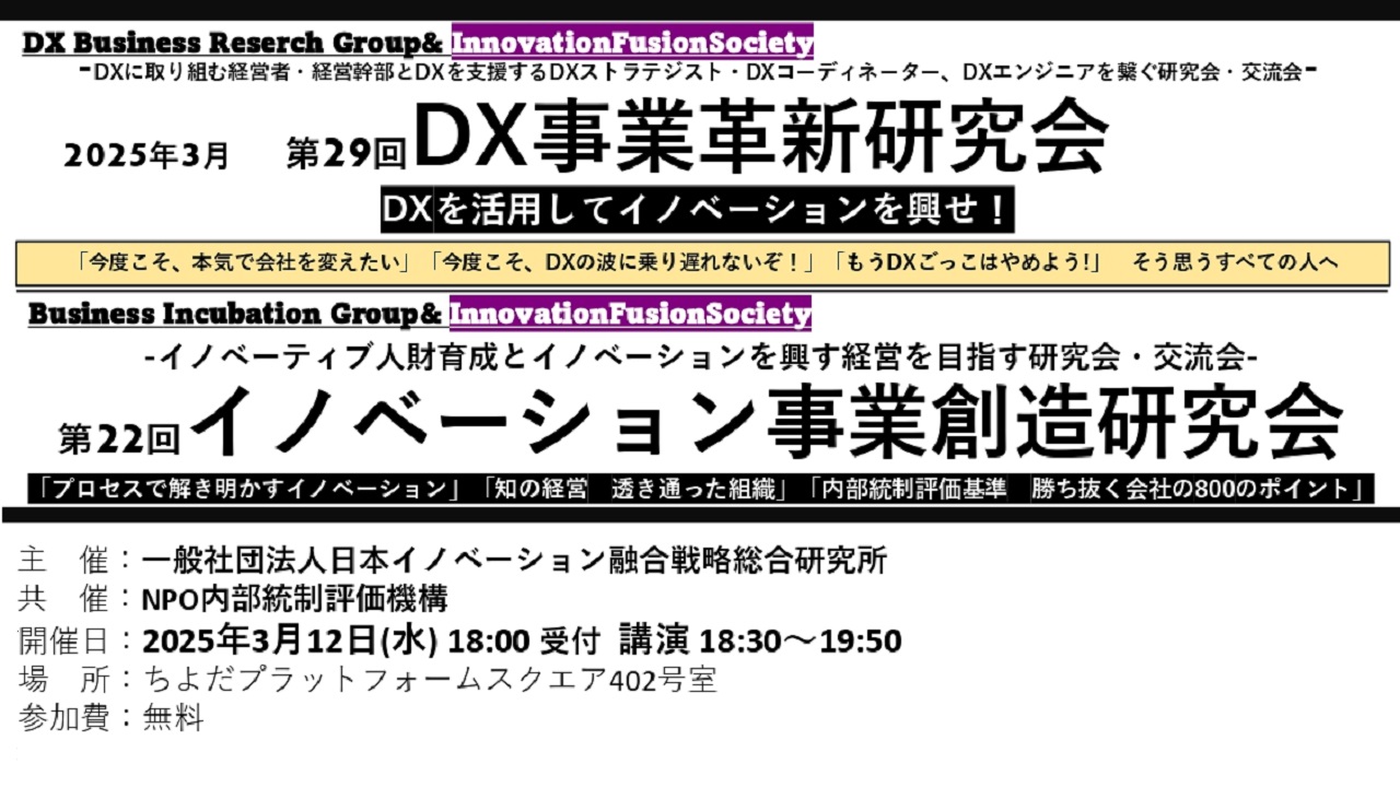 DX事業革新研究会、イノベーション事業創造研究会のご案内「第22回イノベーション事業創造研究会」3月12日(水)18:30より開催いたします。