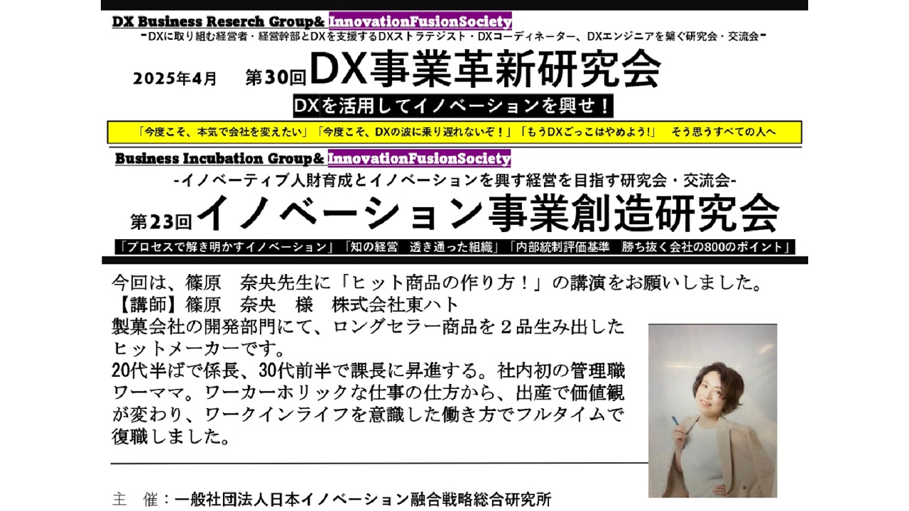 DX事業革新研究会、イノベーション事業創造研究会のご案内「第23回イノベーション事業創造研究会」4月16日(水)18:30より開催いたします。